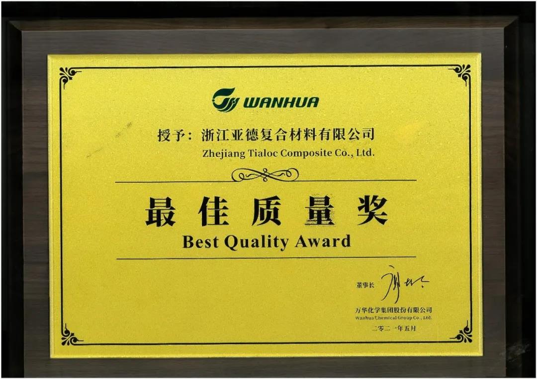 “最佳质量奖”是万华化学用以表彰连续三年以上在质量、服务、技术、价值标准和可持续发展等多个方面表现突出,并为万华化学实现战略发展提供了有力保障和支持的供应商,这是万华对亚德复合材料的又一次肯定与认可,是双方合作历史上的又一里程碑。